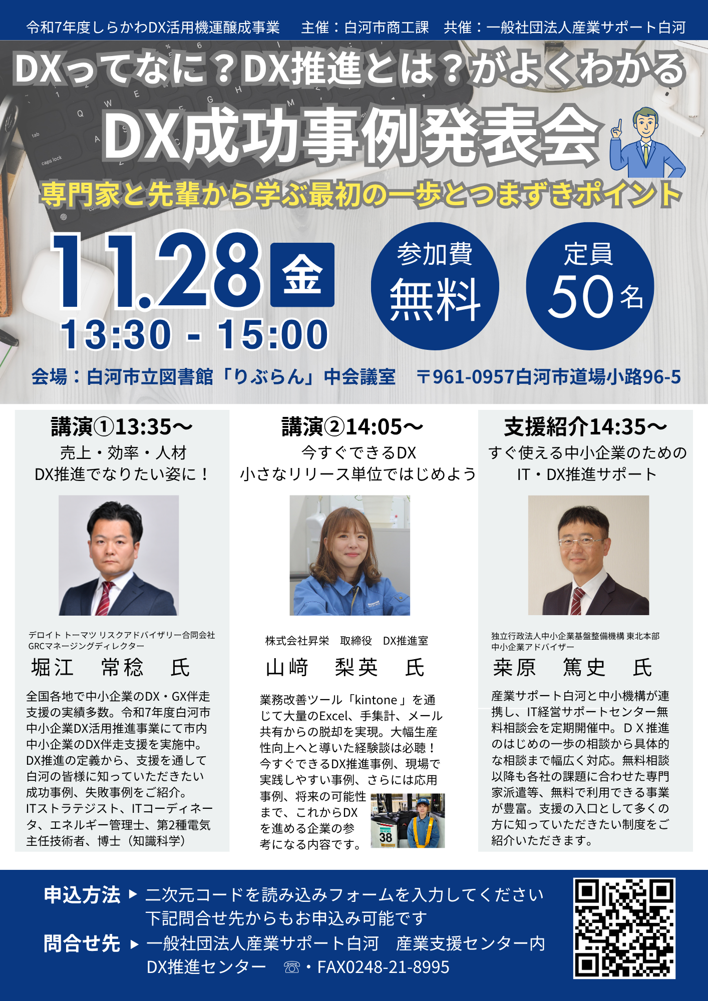 11月28日(金)に白河市で開催されたDX成功事例発表会にて、中小企業のIT・DX推進をサポートする支援メニュー、中小企業基盤整備機構の「IT経営サポートセンター」の紹介を行いました。